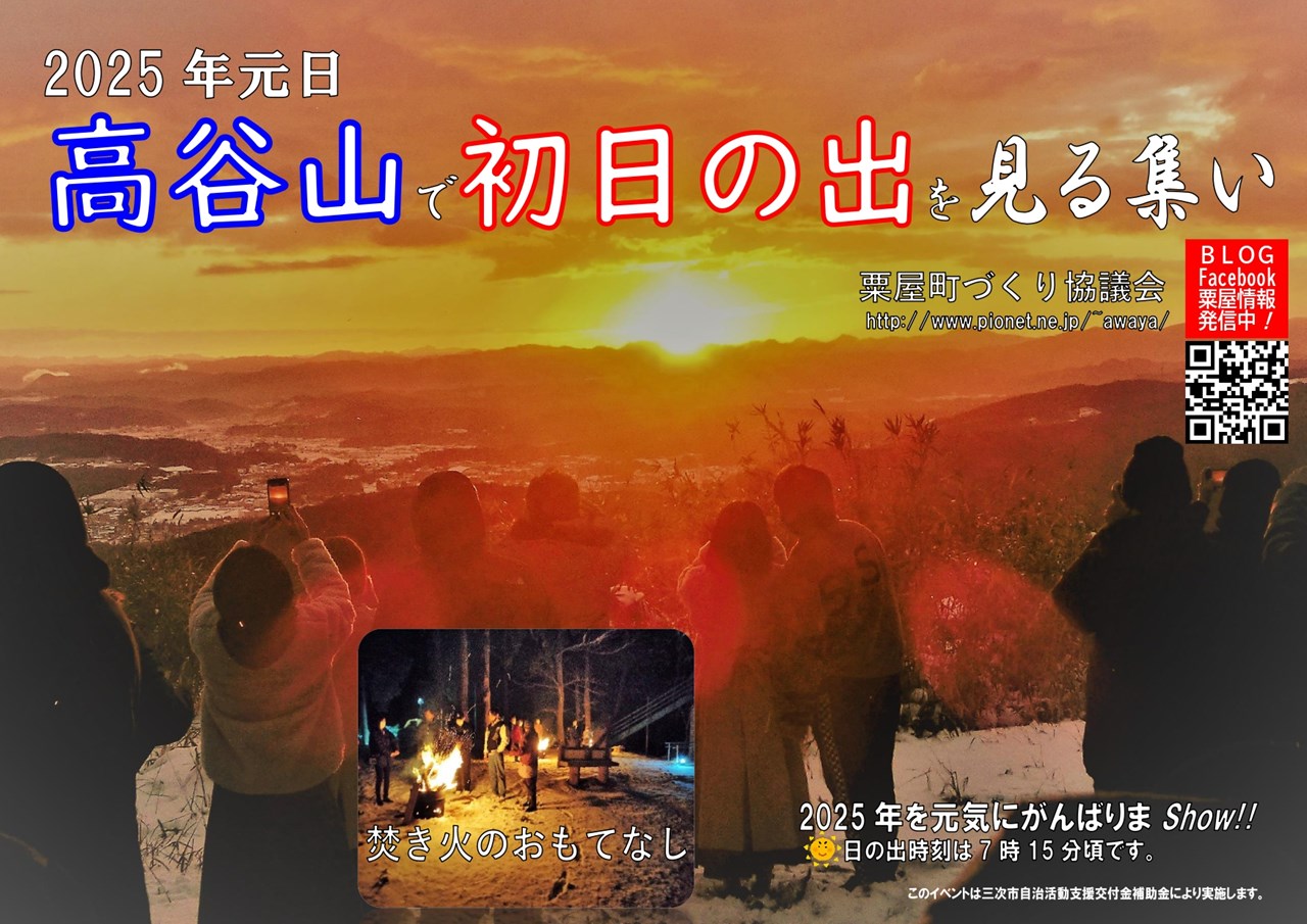 2002(平成14)年から、高谷山展望台で正月元旦のご来光来訪者に、「おもてなし」として、猪汁・ぜんざい・コーヒーで身体を温めて頂き、テナーサックス・トランペットの生演奏を聴いて頂いてきましたが、現在はシンプルに「焚火のおもてなし」をしています。毎年、市内外、県内、県外から約500人くらいが来訪され、一年の新たな思いをはせられています。
