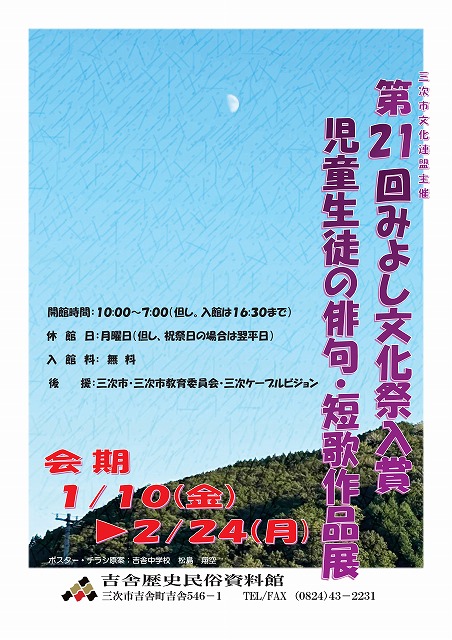 | 三次文化連盟主催「俳句・短歌大会入賞」児童生徒の俳句・短歌作品展 みよし文化祭に投稿された市内の児童生徒の俳句・短歌の中から入賞した作品を展示します。 ユニークな着眼点、ユーモラスな表現など個性あふれる作品をご鑑賞ください。 |