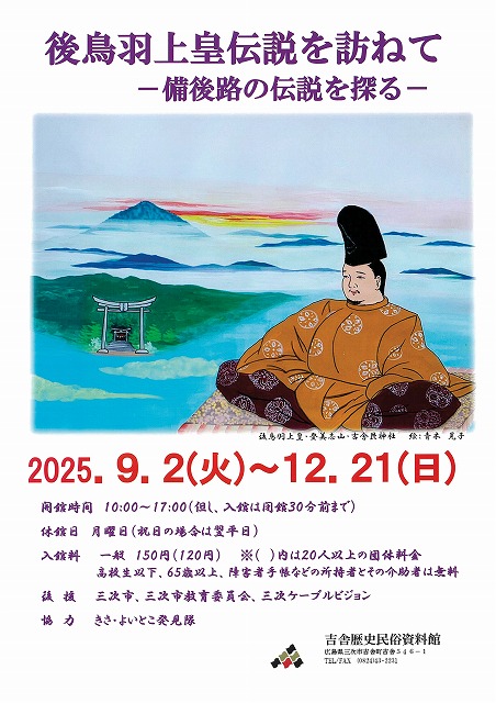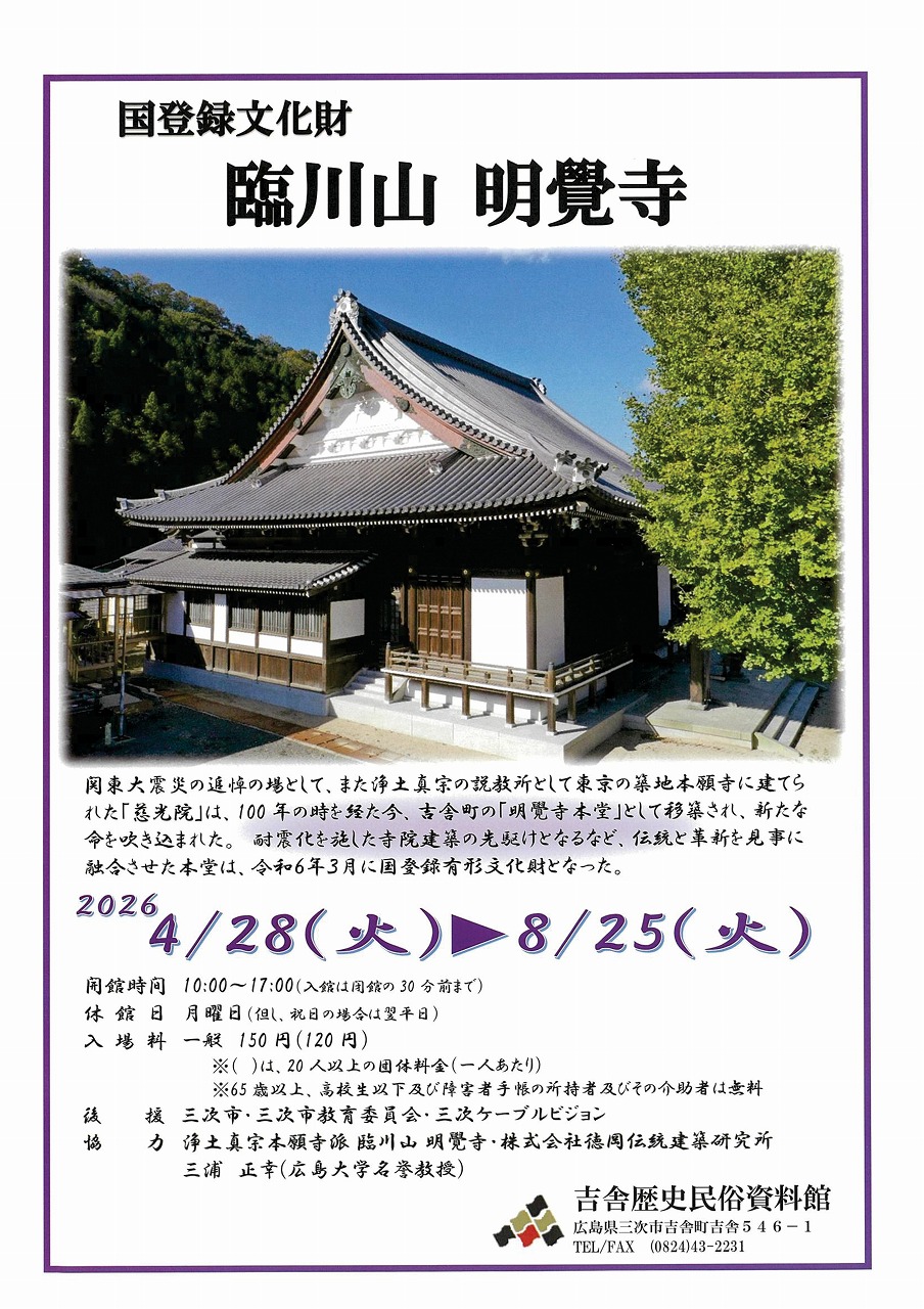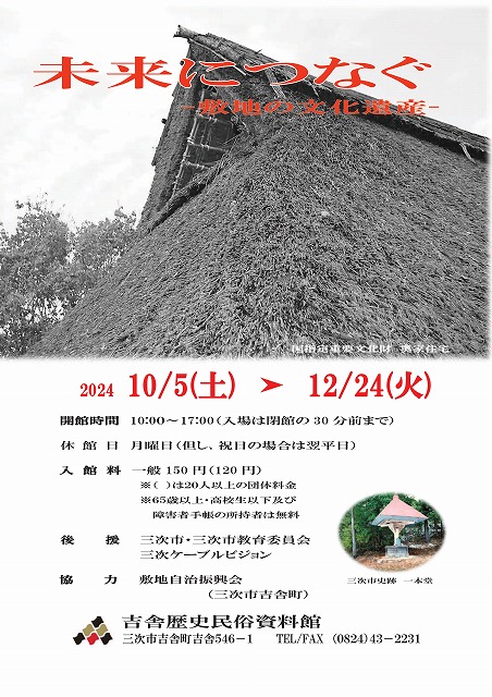 | 「未来につなぐ-敷地の文化遺産-」 三次市吉舎町の敷地地区には、国指定重要文化財奥家住宅をはじめ後世に伝えたい多くの文化財や歴史遺産が残されています。これらの貴重な文化財の写真や保存活動の資料など約20点を展示し紹介します。 |